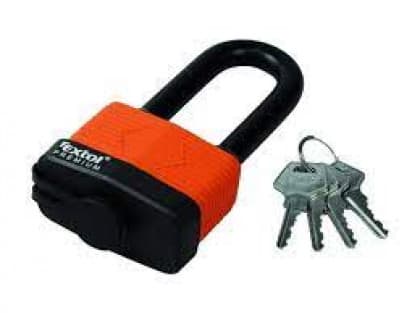 Katanac vodootporan, produžen, 65mm , 4 ključa Može se zaključati bez upotrebe ključa klikom. Kućište od laminiranog pocinkovanog čelika presvučenog plastikom za maksimalnu otpornost na vodu i vlagu Oka brave izrađena od visokokvalitetnog kaljenog čelika presvučenog plastikom Gumena zaptivka protiv prodora vode u unutrašnji deo brave Plastični poklopac koji štiti mesingani cilindar